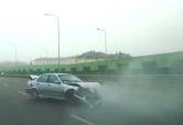 Braucot pa kreiso joslu, "BMW" vadītājs negaidot novirzās no kursa, saslīd un ar savu automašīnu ietriecas ceļa aizsargbarjerās.