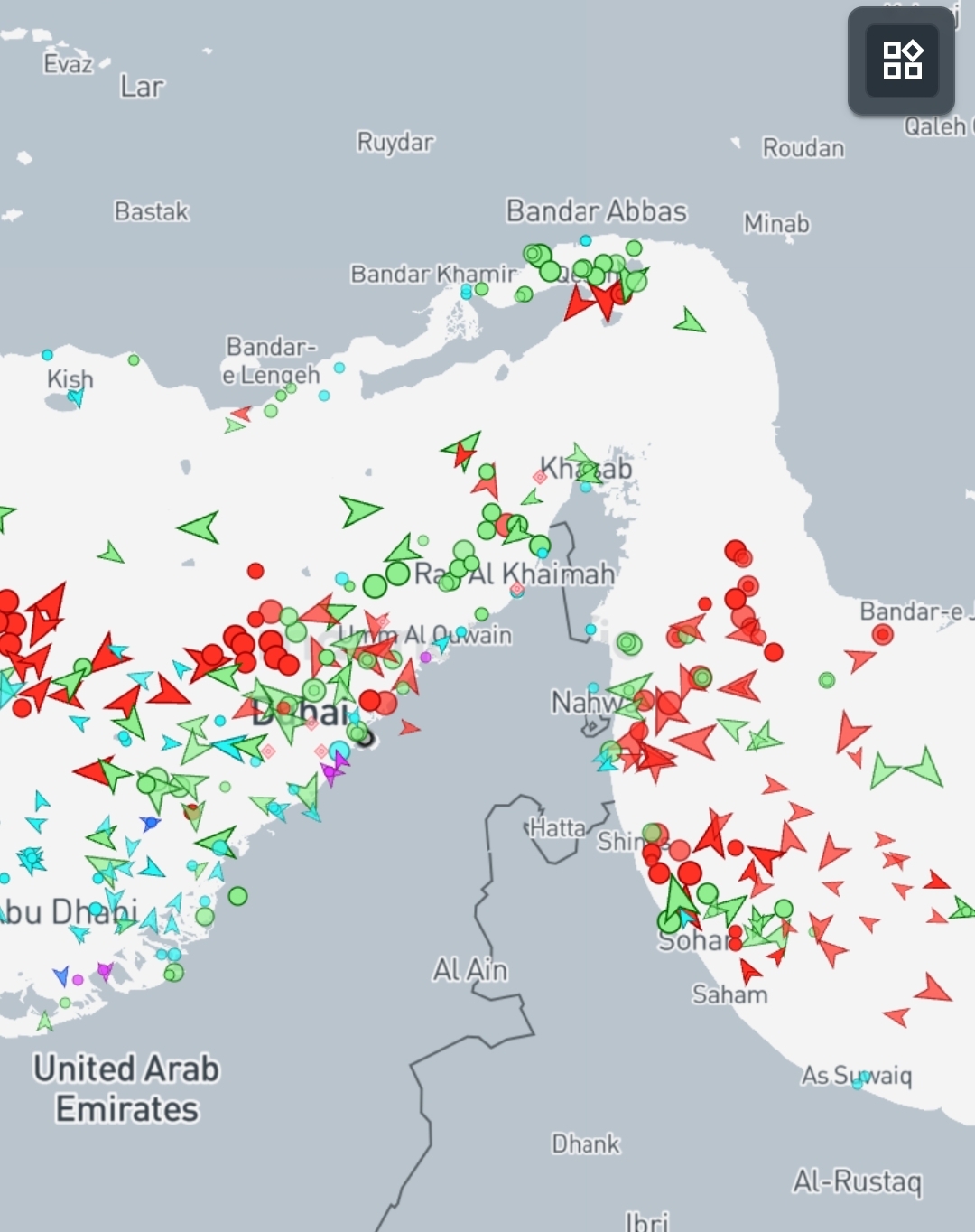 8.04.2026. pagaidām redzami tikai daži kuģi, kas ir ar Irānas vai Ķīnas karogu. Foto: Ekrānuzņēmums