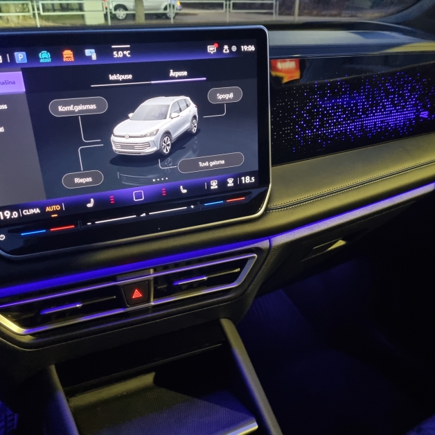 Simpātisks liekas "Volkswagen" jaunajos modeļos izmantotais dizaina risinājums ar izgaismotajiem paneļiem durvīs un priekšējā panelī pasažiera pusē - tas tumsā rada intīmu un mājīgu noskaņu, kas turklāt ilgākā laika posmā nesāk krist uz nerviem. Tas ir būtiski, jo reizēm auto ražotāji ar šīm gaismas spēlēm mēdz pārlieku aizrauties, radot pretēju efektu - tās pēc kāda laika gribas vienkārši izslēgt. Te šāda vēlme nerodas. Bez liekiem pārspīlējumiem  ir arī instrumentu panelis - viss vienkārši, pārskatāmi un saprotami.
