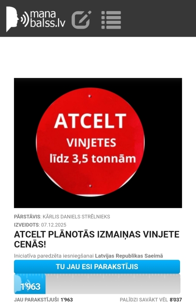 Svētdien, 7. decembrī, plkst. 14.00 tiek plānots protests pie Ministru kabineta, lai paustu savu attieksmi pret Satiksmes ministrijas (Progresīvie) palielināto maksu par vinjetēm no 2026.gada 1.janvāra, kā arī pret ceļu tīkla paplašīnāšanu uz ko tā attieksies - tagad visi Latvijas ceļi.