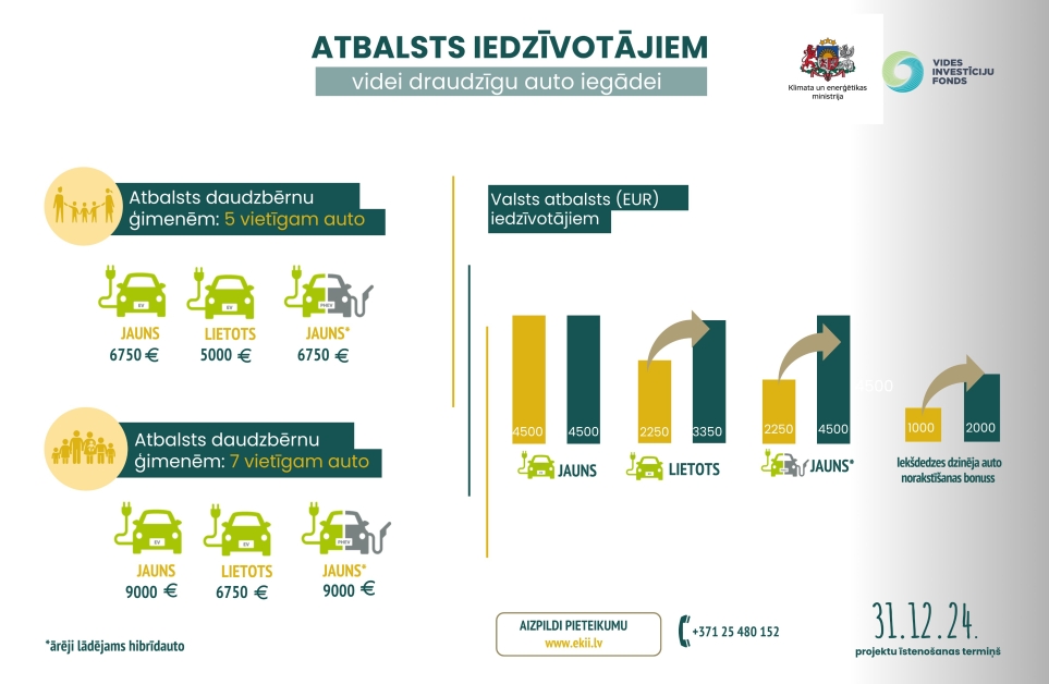 KEM publicētā infografika: ATBALSTS IEDZĪVOTĀJIEM EKII 2026.gadā videi, tā saukto “draudzīgu auto” iegādei: