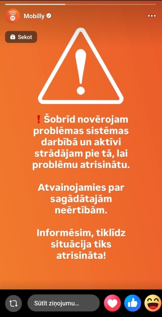 Mobilly publicēja paziņojumu - Šobrīd novērojam problēmas sistēmas darbībā un aktīvi strādājam pie tā, lai problēmu atrisinātu. Atvainojamies par sagādātajām neērtībām. Informēsim, tiklīdz situācija tiks atrisināta