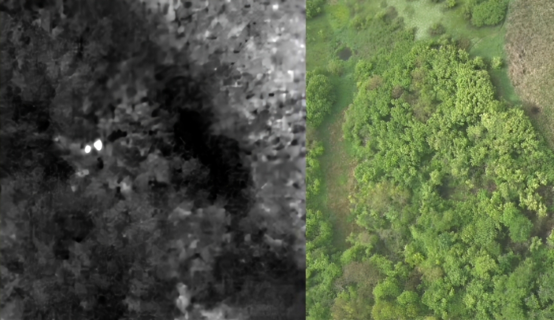 Vasaras dienā lido - viss zaļš un nevarēsi neko redzēt zem lapām, te palīdz termokamera, tas ir “Game changer” kā vari redzēt attēlā zemāk, pretinieku neredzi - pretinieku redzi.