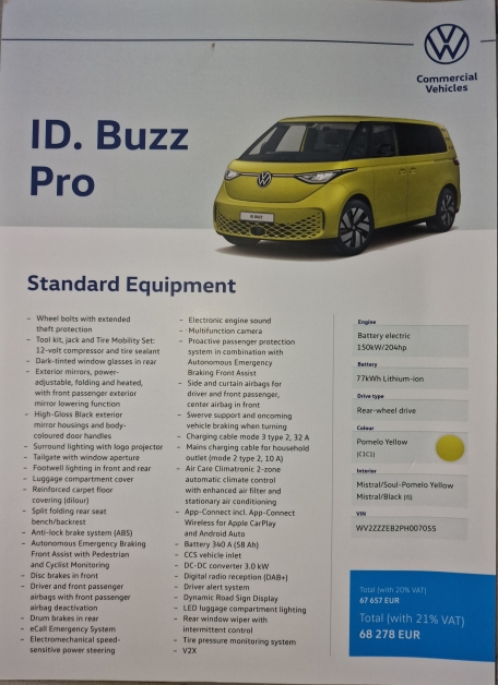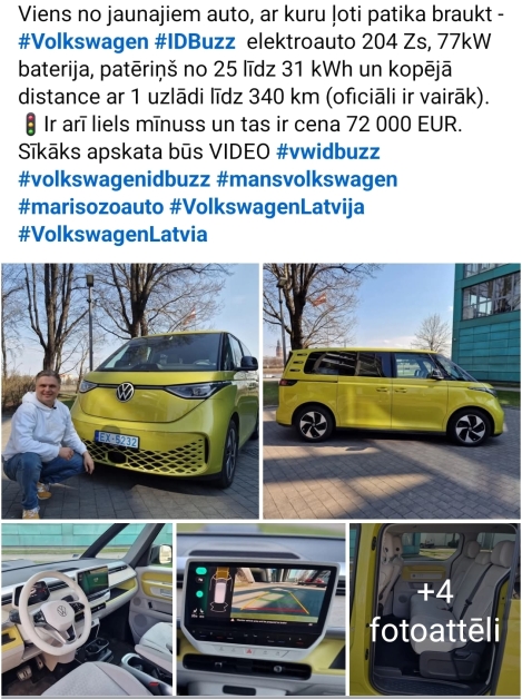 Lūk, kāda bija situācija 2023.gada 11.aprīlī: Volkswagen ID.Buzz elektroauto 204 Zs, 77kW baterija, patēriņš no 25 līdz 31 kWh un kopējā distance ar 1 uzlādi līdz 340 km (oficiāli ir vairāk). Ir arī liels mīnuss un tas ir cena 72 000 EUR