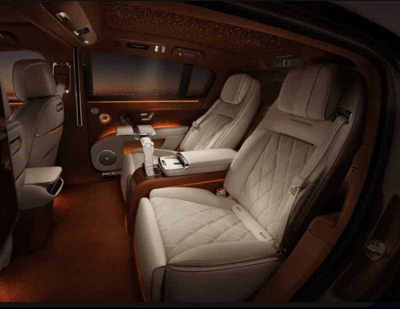 Salonā izmantota dabīgā āda, koks, alumīnijs un kristāla elementi. Pieejama četru vai piecu sēdvietu konfigurācija. Aizmugurējie pasažieri var baudīt: