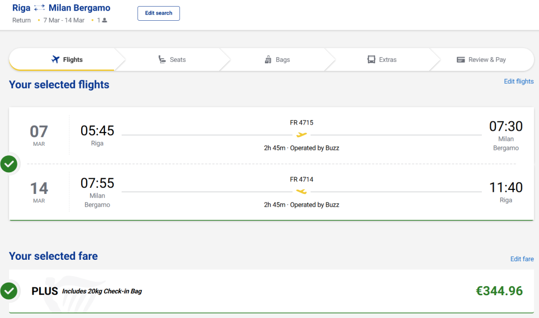 Nez kādēļ Ryan ir cits viedoklis - 345Eur, nevis 20. VIENAM! Piedevām pamēģini arī izdomāt kā izskatās nokļūšana Bergamo lidostā, lai izlidotu 7:55. Vai tik nebūs nakts brauciens pa kalnu ceļiem ar to tavu nomas auto…