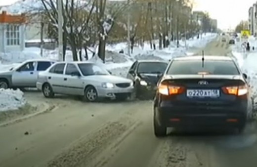 Augstie sniega vaļņi un automobilis, kas veic pagriezienu un piestāj šaurās ielas dēļ aizsedzot skatu, "piespiež" izbraucošā auto vadītāju kļūdīties. Lasīt vairāk