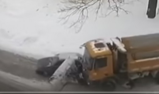 Sniega tīrītāja šoferis nepamana vieglo automobili, kas iebrauc tā aklajā zonā. Lasīt vairāk