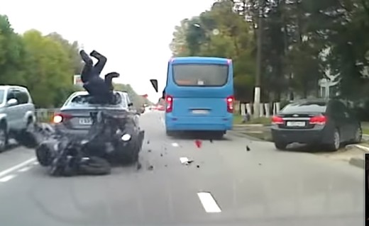 Hyundai Solaris apstājas, lai pagrieztos pa kreisi un saņem negaidītu "dāvanu" - motociklistu, kas izsit aizmugures stiklu un paliek gulēt uz bagāžas nodalījuma vāka. Lasīt vairāk