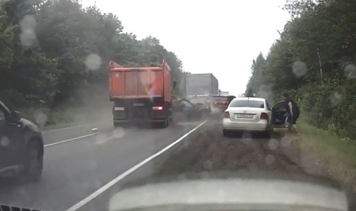 Autovadītāji nav pietiekami uzmanīgi vietā, kur satiksme jau labu brīdi apstājusies. Vispirms nepagūst nobremzēt kāds vieglās mašīnas šoferis, tad kravinieks, kas sastumj vairākus spēkratus kaudzē (no 0:30). Lasīt vairāk