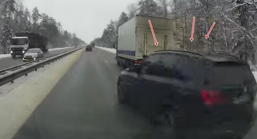 Steidzīgs "BMW" apvidnieka vadītājs apsteidz video autoru pa labo pusi, taču nespēj savaldīt savu auto un uztriecas kraviniekam, kas nobrauc no ceļa un apgāžas. Lasīt vairāk