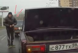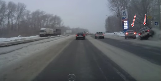 Divas automašīnas brauc diezgan cieši viena aiz otras līdz brīdim, kad priekšā braucošais izdomā iegriezties degvielas uzpildes stacijā (skatīt no 0:20). Lasīt vairāk