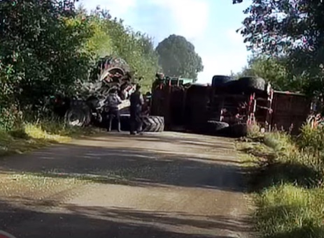 Kad piekabe sašūpojas, lauksaimniecības tehnikas vadītājam neizdodas izlīdzināt gaitu un jau pēc mirkļa traktors ar piekabi noguļas uz sāniem. Lasīt vairāk