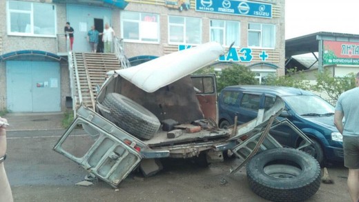 Krievijas pilsētā Bratskā pārsprāgusi kravas automašīnas riepa praktiski iznīcinājusi UAZ automobili, kas tika izmantots, lai riepu nogādātu autotransporta uzņēmumam. Riepa bija nesen saremontēta un divi vīrieši ar UAZ bija atbraukuši tai pakaļ.