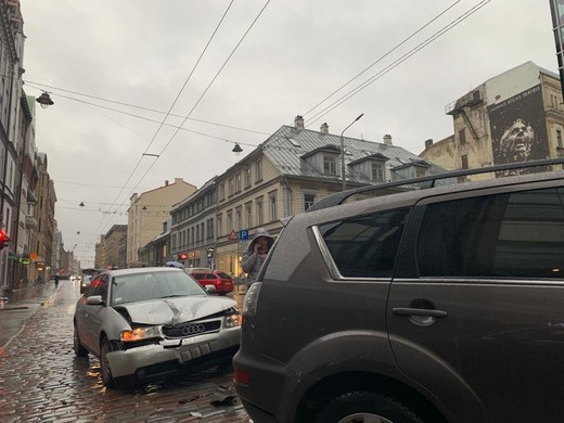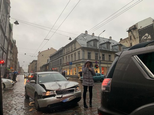 Šodien, 1.februārī, Rīgā, notikusi avārija - Audi ietriecies apvidus auto aizmugurē. Iespējams, Audi neņēma vērā apstākli, ka slapjā laikā bruģis ir slidens, tādēļ nepaguva nobremzēt.