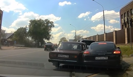 Jaudīgā Porsche Panamera vadītājs lepni traucas garām visiem līdz atduras pret ievērojami lēnāk braucošo VAZ, kas negaidot griež pa labi. Lasīt vairāk