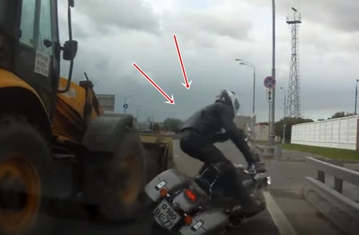 Motociklists mēģina izspraukties pa vidu braucošam traktoram un stāvošam automobilim, taču, šķiet, ir piemirsis par sava braucamrīka gabarītiem. Lasīt vairāk