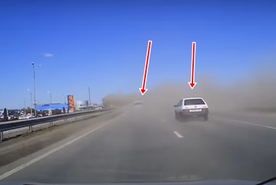 Ceļa sakopšanas tehnika Toljati pilsētā Krievijā saceļ tādu putekļu mākoni, ka autobraucējiem tajā pilnībā pazūd redzamība. Rezultātā avarē divas automašīnas, kas saduras viena ar otru (no 0:15). Lasīt vairāk