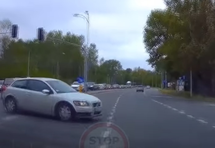 Video autors iebrauc krustojumā pie luksofora zaļā signāla un saduras ar Volvo, kura vadītājs aizšķērso ceļu, griežoties pa kreisi. Lasīt vairāk