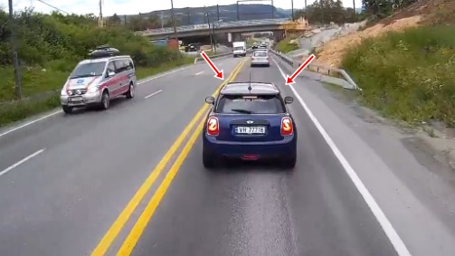 Video no ASV - "Mini Cooper" vadītājs, iespējams, apvainojas (klausies audio 0:10) par to, ka kravinieks pārkārtojoties liek tam piebremzēt. Nolūkā "atriebties", viņš apdzen smago un strauji nobremzē tā priekšā, taču 50 tonnas smagā fūre nepagūst apstāties un uzsit "Mini" pa dibenu. Lasīt vairāk