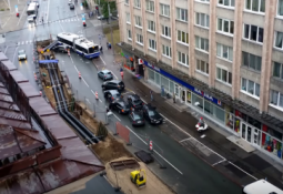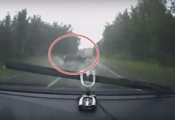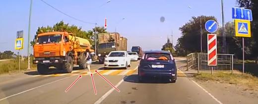 Gājēja izvēlas ārkārtīgi nepiemērotu brīdi, lai šķērsotu ceļu - abos virzienos ir intensīva kustība un pārejai tuvojas smagi piekrauts transports. Lasīt vairāk