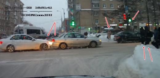 Autovadītājs apstājas, lai palaistu gājējus, taču aizmugurē braucošais Mercedes uztriecas tam virsū (skatīt no 0:20). Lasīt vairāk