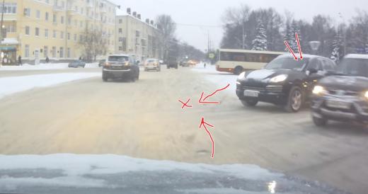 Izbraucot uz galvenā ceļa, "Porsche" vadītājs nepārliecinās par drošību un saduras ar video autoru (skatīt no 1:35). Lasīt vairāk