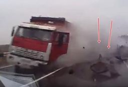 Kravas auto, griežoties pa labi, noplēš buferi vieglajam auto, kas, iespējams, iebraucis par dziļu krustojumā. Lasīt vairāk