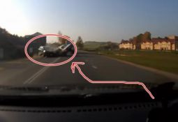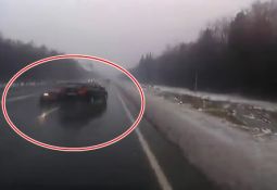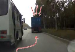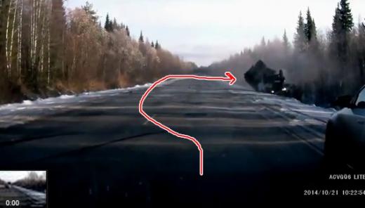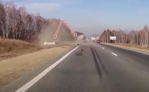 "Audi" uzlido gaisā un apmetot vairākus kūleņus paliek ceļmalas grāvī pēc tam, kad vadītājs uztriecas smagās automašīnas piekabes riteņiem, nespējot noreaģēt uz kravinieka negaidīto pārkārtošanās manevru (skatīt no 0:25). Lasīt vairāk