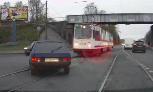 Tramvajs taranē VAZ, kas apstājies uz sliedēm. Lasīt vairāk