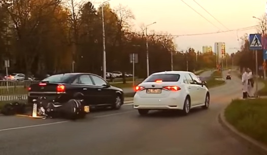 Autovadītāji apstājas pirms pārejas, lai palaistu gājējus, taču motociklists to nespēj izdarīt un krītot, gandrīz paslīd zem mašīnas. Lasīt vairāk