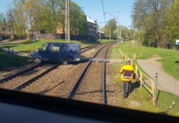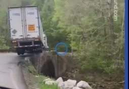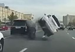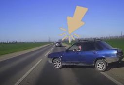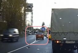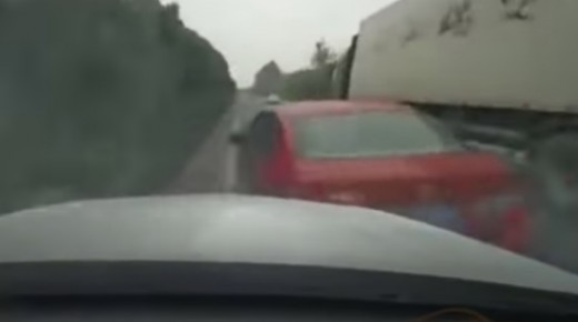 Steidzīgs autobraucējs mēģina izspraukties pa šauru spraugu starp kravas auto labajā pusē un vieglo kreisajā, taču sagriežas un aizķeras aiz smagā auto piekabes. Lasīt vairāk
