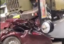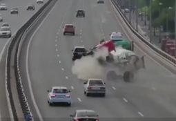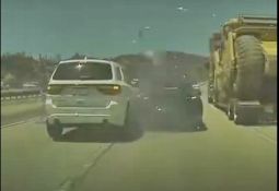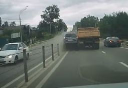 Traktors pazaudē riepu, kas atsitoties pret pretimbraucošo automobili paspēj "ieriebt" arī video filmētājam. Lasīt vairāk