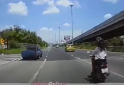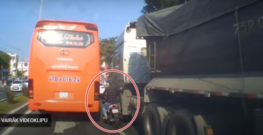 Motobraucējam neizdodas izspraukties pa šauru spraugu, kas paliek starp autobusu un kravas automobili. Lasīt vairāk