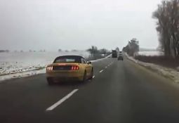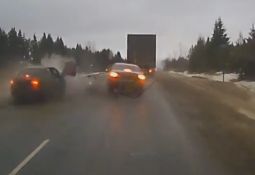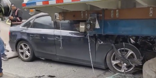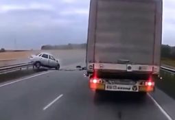 Motociklists maina joslu, nepārliecinoties par to, kas notiek aizmugurē. Rezultātā Audi, kas cenšas nesabraukt motociklistu, ietriecas stāvoša kravas auto aizmugurē. Laimīgā kārtā Audi pasažieri tiek cauri ar nelieliem savainojumiem. Lasīt vairāk