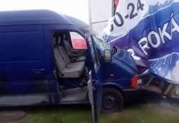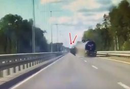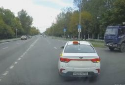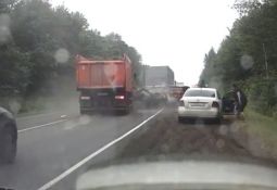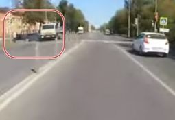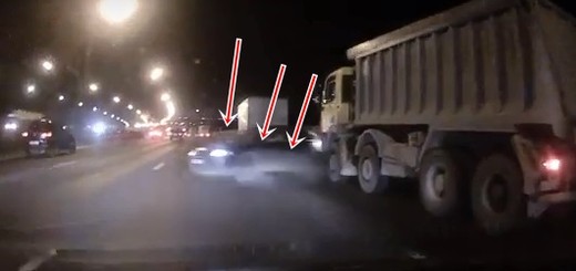 Vieglais auto nokļūst kravas mašīnas aklajā zonā, tiek aizķerts un izstumts priekšā video autoram, kurš izvairās pēdējā brīdī. Lasīt vairāk