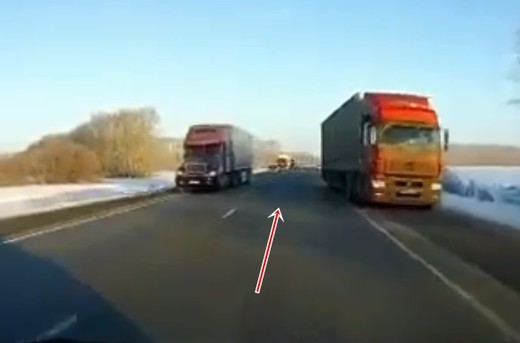 Video autors nokļūst bīstamā situācijā, kad viens no kravas auto izbrauc pretējā joslā, lai apdzītu otru smagsvaru. Lasīt vairāk