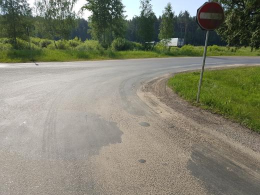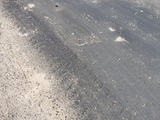 Kā mēs redzam asfalta segums šajā vietā ir ļoti mīkst, tajā jau ir iespiedušās smagās automašīnas riepas un daži gabali par ir izrauti