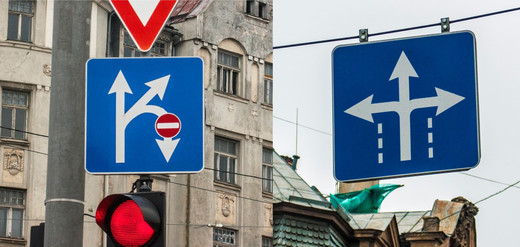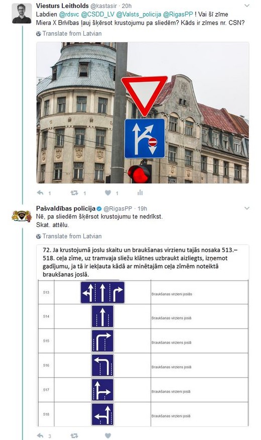 Bet vai krustojumā uzstādītā zīme tiešām aizliedz braukt pa tramvaja sliedēm? Kā redzams attēlā, konkrētā zīme uz Miera ielas atšķiras no tām, kas regulē braukšanas virzienus joslās tālāk, Matīsa un Tērbatas, kā arī Matīsa un Kr. Barona ielu krustojumos - tur nepārprotami ir uzstādītas 513.-518. grupas ceļa zīmes.