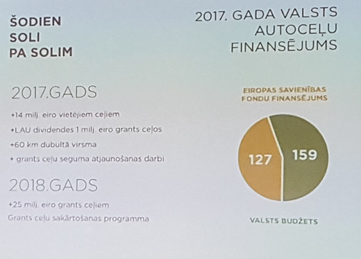 2020. gadā valsts autoceļiem būs pieejams tikai valsts budžeta finansējums, un valsts budžeta bāzē tas ir plānots 159 milj. eiro apmērā, no tiem 84 milj. eiro ceļu uzturēšanas darbiem (ceļu tīrīšanai ziemā, ceļmalu sakopšanai, bedrīšu labošanai u.c.) un kapitālieguldījumiem (remontdarbiem) atliks vien 75 miljoni eiro.