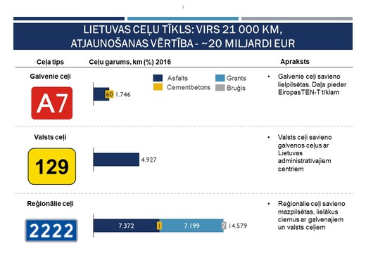 Saskaņā ar Lietuvas Ceļu Administrācijas datiem kopējais ceļu tīkls Lietuvā ir virs 21 000 km garš, no kuriem 13 800 km ir asfaltēti – 65% no tiem ir sliktā stāvoklī, it īpaši valsts nozīmes ceļi. Pat ieguldot krietni vairāk līdzekļus, nekā Latvijā, līdz 95% finansējuma tiek piešķirts vien esošās infrastruktūras sabrukšanas apturēšanai.