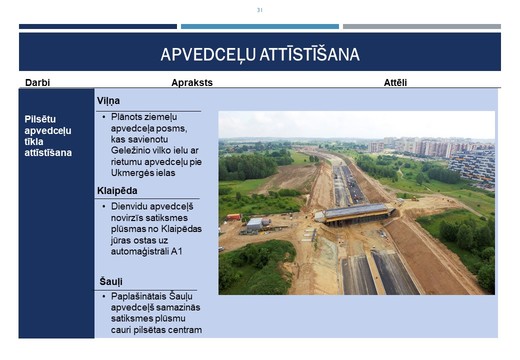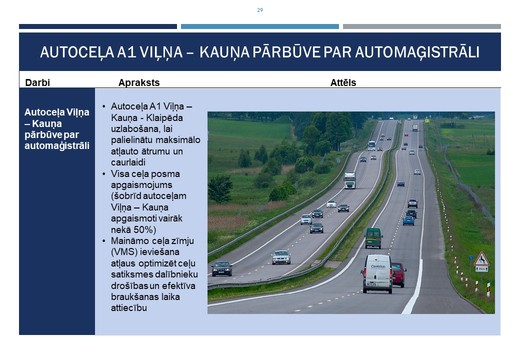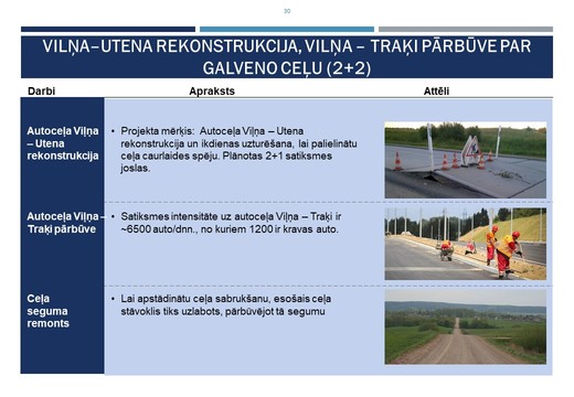 Tāpat plānots pārbūvēt automaģistrāli Viļņa-Kauņa-Klaipēda, autoceļus Viļņa-Traķi un Viļņa-Utena, kā arī izveidot apvedceļus Viļņas un Klaipēdas pilsētās.