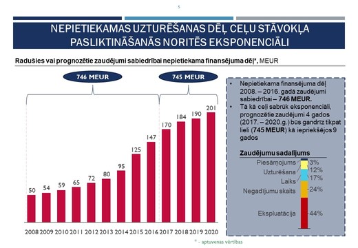 Prognozēts, ka turpmākajos četros gados zaudējumi būs tikpat lieli, cik iepriekšējos 9 gados. Nepalielinot finansējumu, ik gadu sliktas kvalitātes ceļu īpatsvars Lietuvā palielināsies par 7-10%.