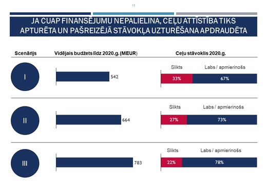 Otrs scenārijs paredz vidējo budžetu 664 miljonu EUR apjomā, kas ļautu izdarīt uz pusi mazāk, nekā iepriekšminētajā scenārijā – 250 km grants ceļu, 80 km valsts un reģionālo, 150 km galveno ceļu uzturēšana, un 900 km remonts. Bet, ja vidējais gada budžets līdz 2020. gadam būs 542 milj. EUR, tad gadā būs iespējams uzturēt vairs 220 km grants, 15 km valsts un reģionālos, 45 km galvenos ceļus, kā arī veikt 160 km remontu.