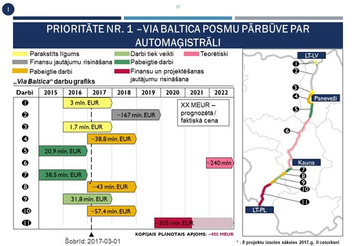 Lieli darbi ieplānoti tranzīta satiksmes plūsmu optimizācijai. Iespaidīgākais – “Via Baltica” pārbūve par automaģistrāli, ko plānots pabeigt 2022. gadā. Pretēji Latvijas Republikas Satiksmes ministrijai, kas šoseju pārbūvēšanu par automaģistrēlām uzskata par ekonomiski nepamatotām, atbildīgie Lietuvā uzskaita sociālos un ekonomiskos ieguvumus, kas radīsies izveidojot automaģistrāli. Pēc darbu pabeigšanas šķērsot Lietuvu no Latvijas līdz Polijas robežai būs iespējams 3 stundās, nevis četrās, kā līdz šim. Vidējais ātrums pieaugs no 68 līdz 87 km/h, un tiks izglābtas vismaz 10 dzīvības gadā.