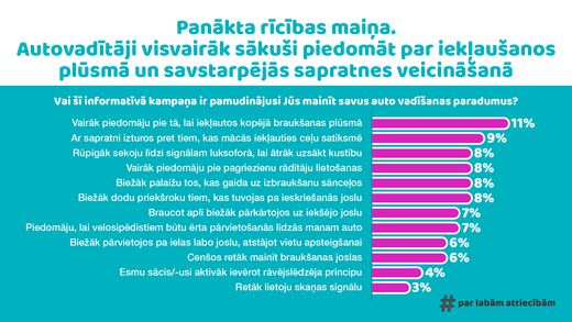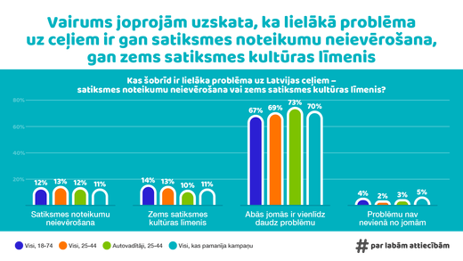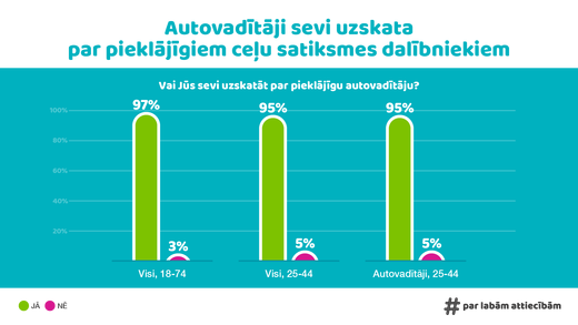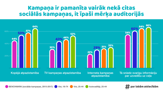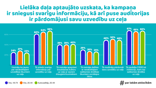 Aptaujas secinājumus apstiprina arī lielā iedzīvotāju aktivitāte, iesaistoties nesen īstenotajā CSDD kampaņā “Par labām attiecībām”, kuras laikā vairāk nekā 500 Latvijas iedzīvotāju sniedza savus priekšlikumus braukšanas kultūras uzlabošanai. Veiktā izpēte apliecina, ka ceļu satiksmes dalībnieki pamana šāda veida kampaņas un ietekmējas no to vēstījumiem.