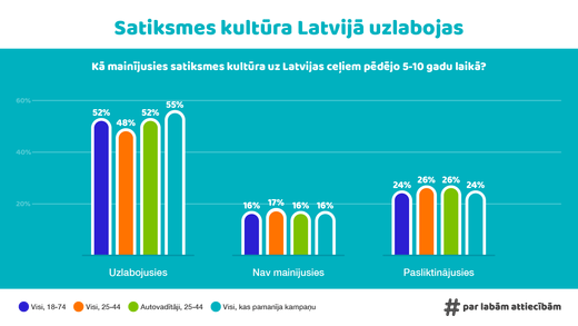 Šī gada rudenī veiktā Ceļu satiksmes drošības direkcijas (CSDD) aptauja liecina – vairums (55% respondentu) iedzīvotāju uzskata, ka pēdējos 5 – 10 gados ceļu satiksmes kultūra Latvijā ir ievērojami uzlabojusies. Aptaujātie uzsver, ka situācijas uzlabošanos ievērojami sekmējušas satiksmes drošības kampaņas par dažādām tēmām.