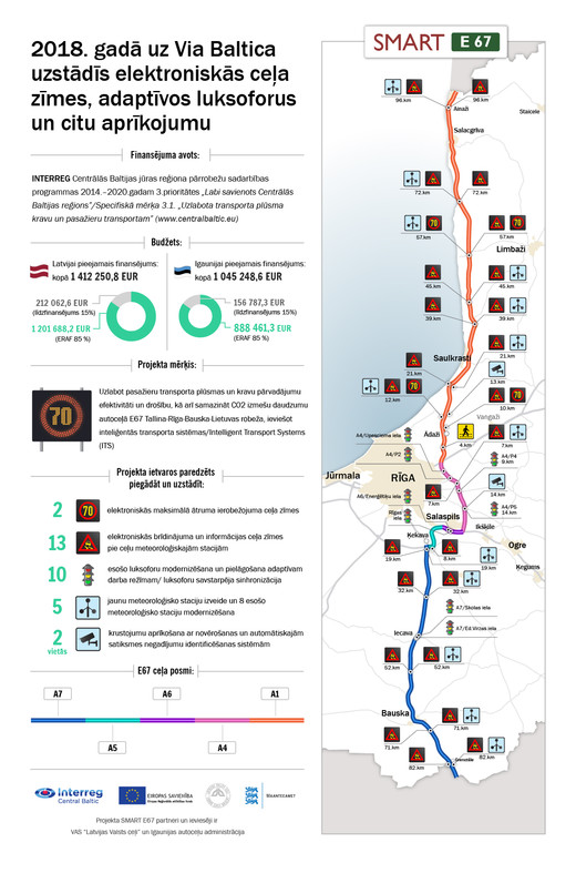 Līdz šā gada rudenim uz Via Baltica šosejas tiks uzstādīts mūsdienīgs elektronisks ceļa aprīkojums. Projekta SMART E67 ietvaros tiks uzstādītas 13 mainīgas informācijas ceļa zīmes un modernizēti 10 esošie luksofori, lai gaismas tiktu pārslēgtas atbilstoši reālai satiksmes situācijai.
