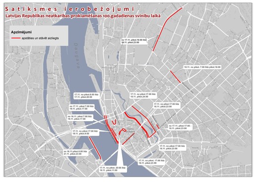 No plkst.11 līdz plkst.17 slēgs transportlīdzekļu satiksmi Ģenerāļa Radziņa krastmalas posmā un virzienā no Dzelzceļa tilta līdz Turgeņeva ielai, bet no plkst.12.30 līdz plkst.24 - Aspazijas bulvāra posmā no Krišjāņa Barona ielas līdz Kaļķu ielai un Zigfrīda Annas Meierovica bulvārī.