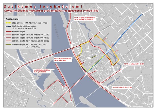 Satiksme šajā dienā atsevišķos laika posmos būs slēgta arī visās ielās, kur notiks militārā parāde un lāpu gājiens. Tāpat ierobežota satiksme būs teju visās Vecrīgas ielās, kā arī smagā transporta kustības ierobežojumi būs noteikti Eksporta ielas posmā no Hanzas ielas līdz Muitas ielai un Krasta ielas posmā no Salu tilta līdz 13.janvāra ielai.